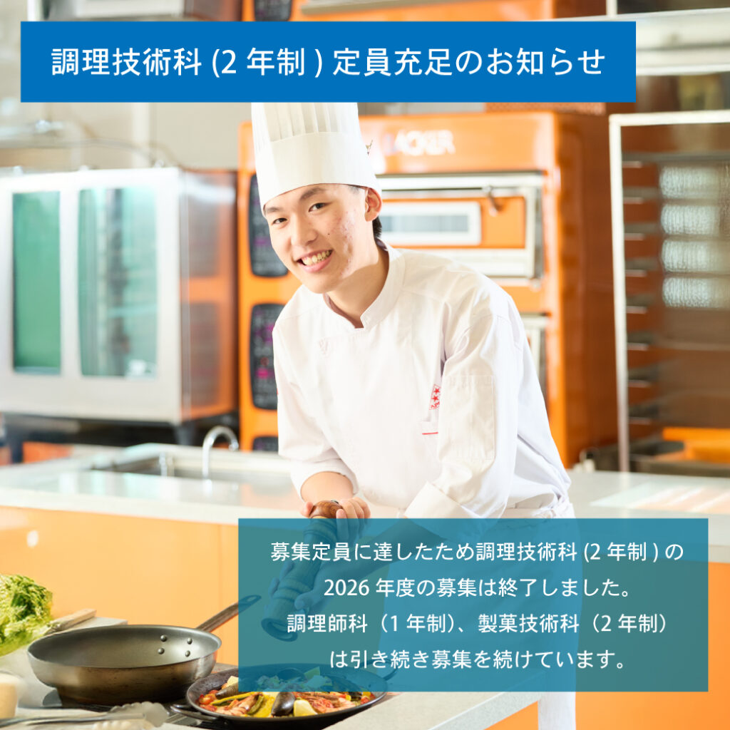 2026年4月入学募集について、 調理技術科(2年制)は募集定員に達したため願書の受付を終了させていただきます。