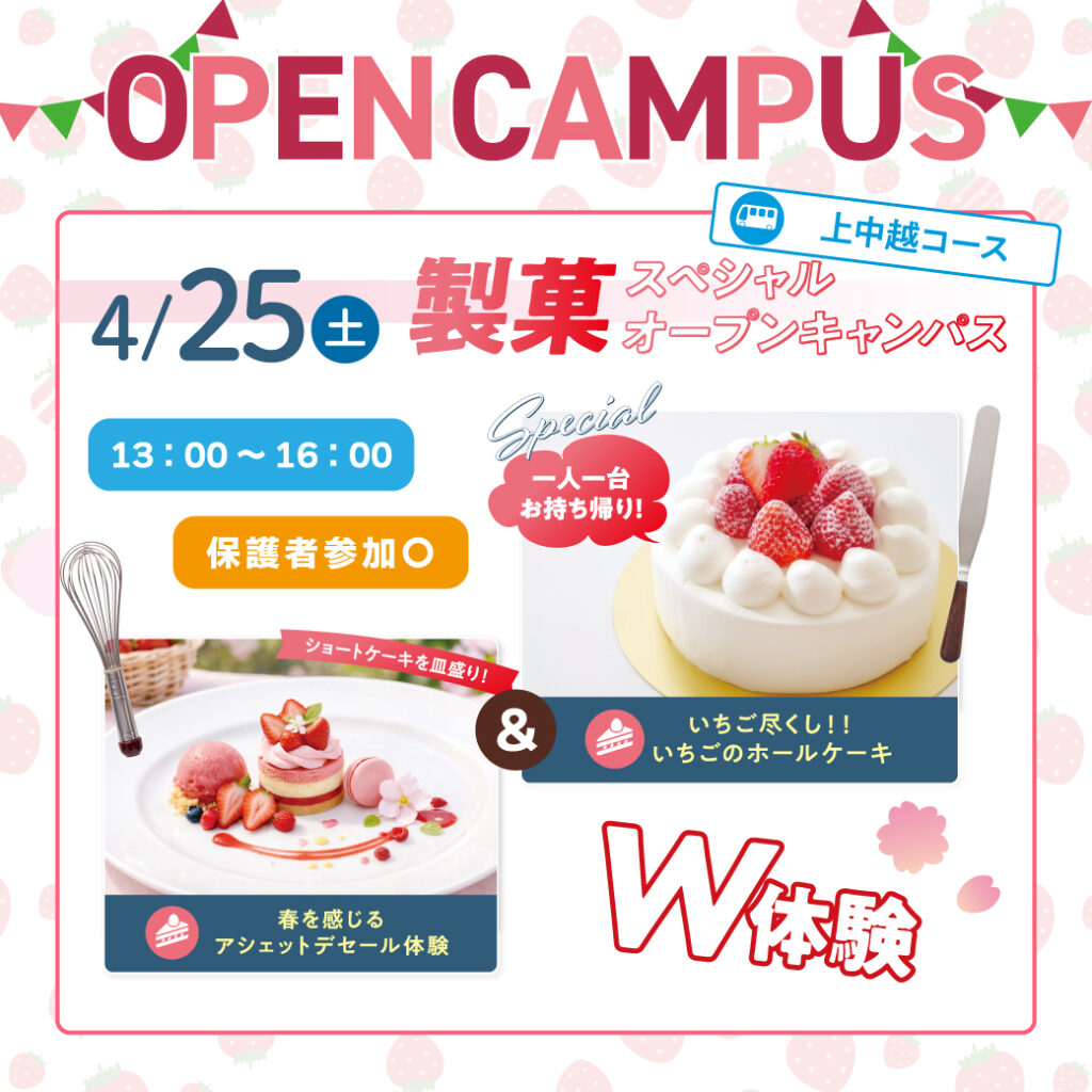 4/25(土) 製菓体験スペシャルオープンキャンパス いちごのホールケーキ🎂🍓アシェットデセール体験✨ 高田駅・柏崎駅・長岡駅の無料送迎あり!