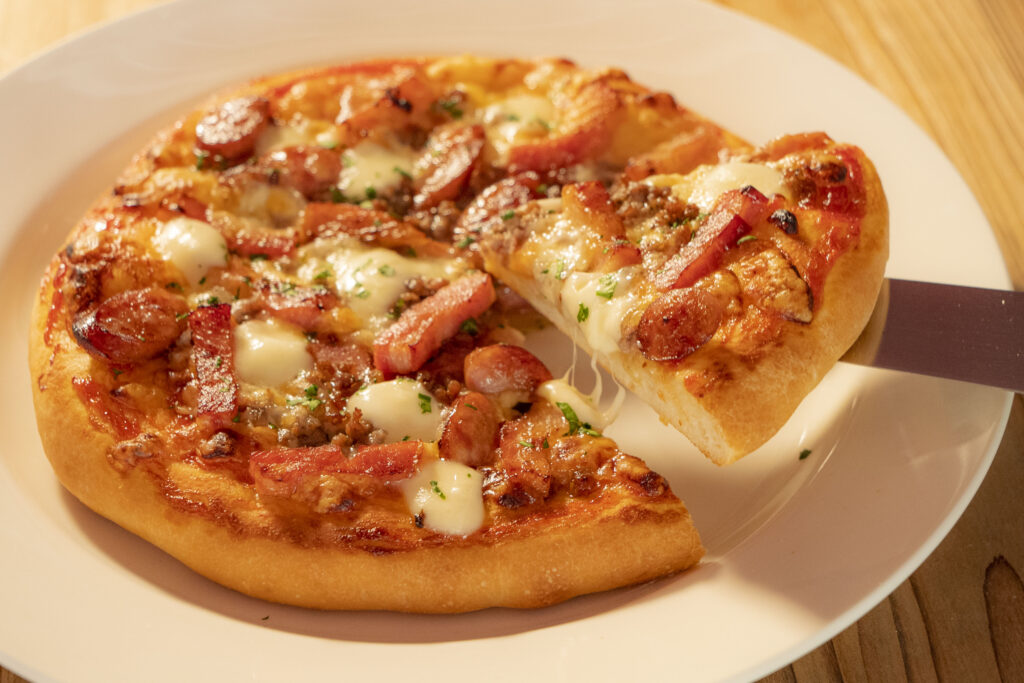 生地を伸ばすところから、具材を並べておいしいピザを作ります🍕