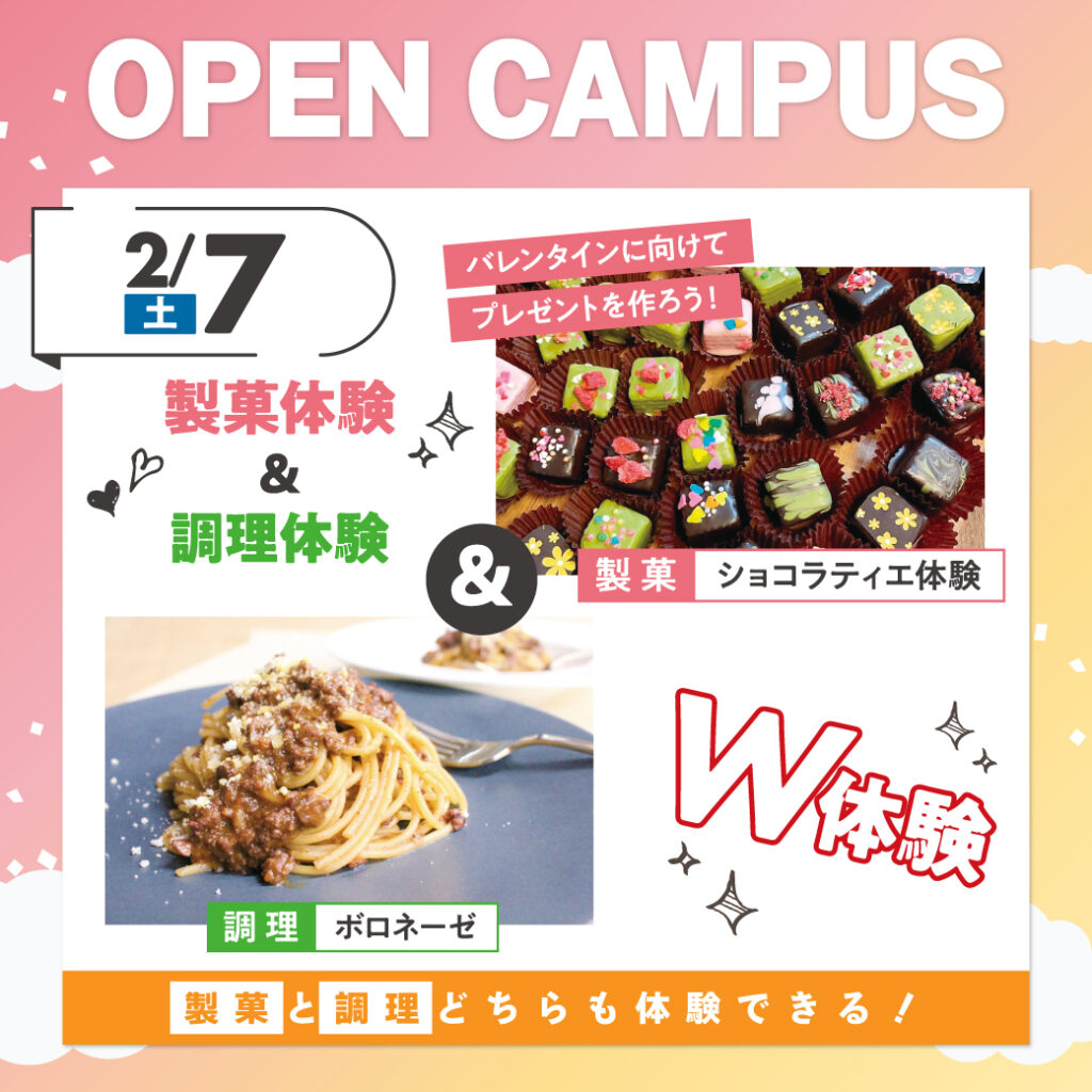 オープンキャンパスでは学校の詳しい説明、おいしく楽しい実習体験!また校舎見学や進路相談など行います!