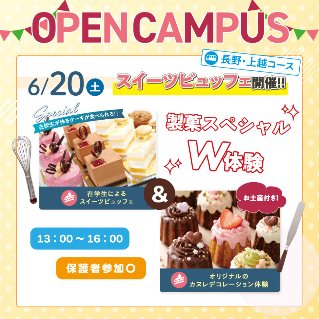6/20(土) スイーツビュッフェ開催✨✨✨ 製菓体験:カヌレデコレーション💕 長野駅・高田駅・柏崎駅・長岡駅の無料送迎あり!