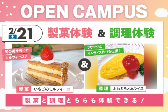 2/21(土) 製菓体験:いちごのミルフィーユ🍓 調理体験:ふわとろオムラ…